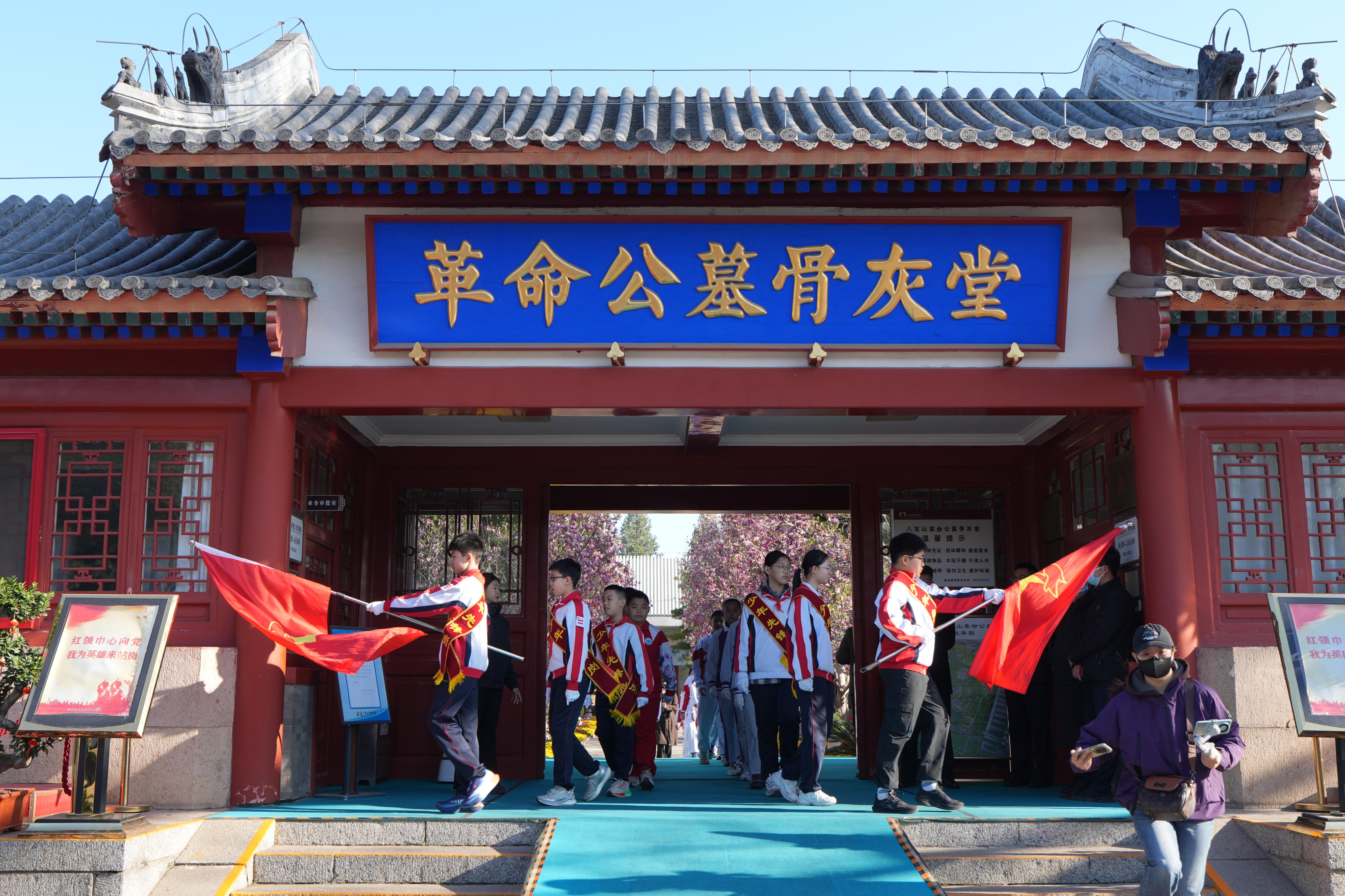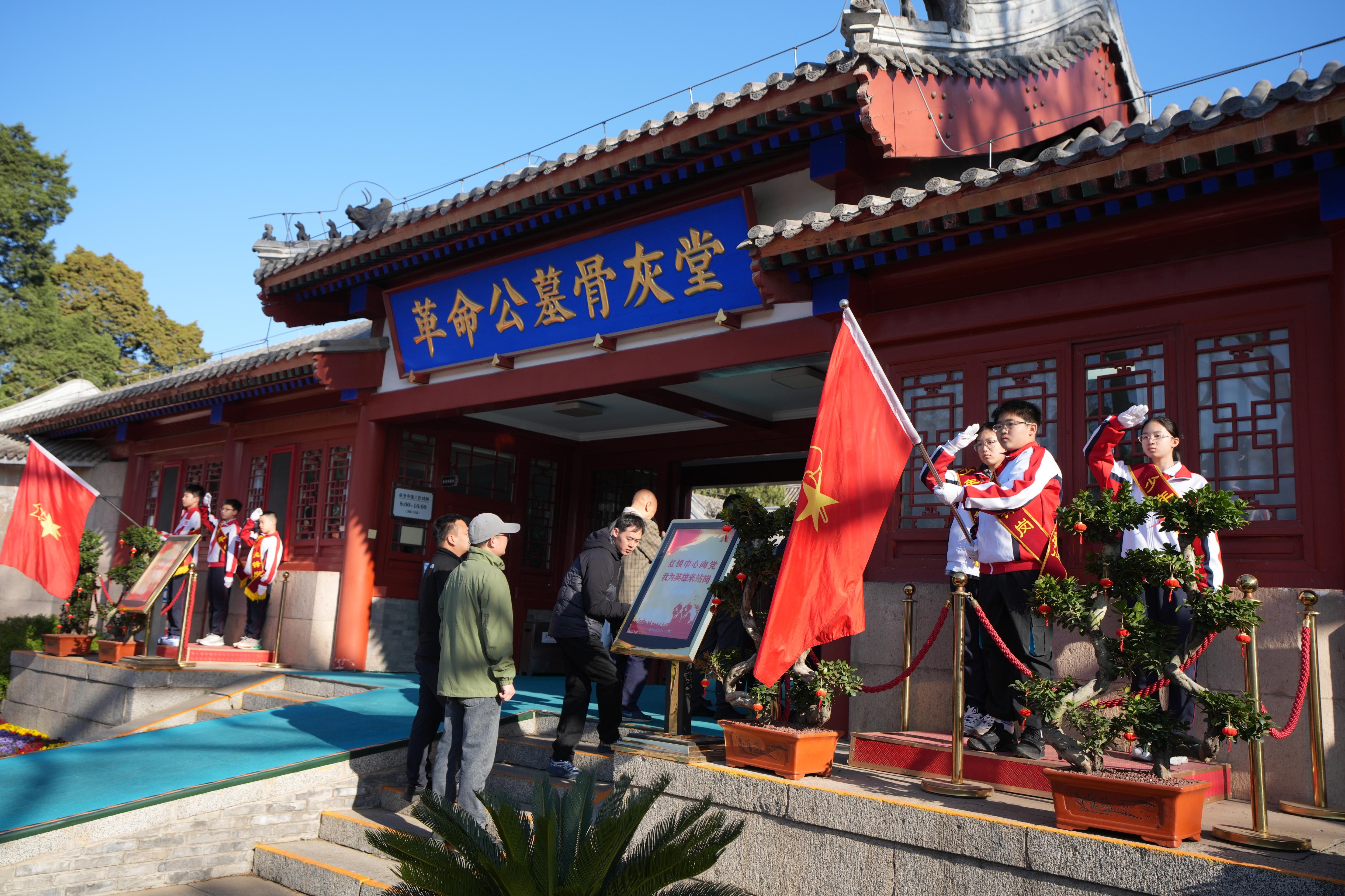 晨光微熹,已经有不少市民来到八宝山革命公墓祭扫。不到8点,在革命公墓骨灰堂前的少年先锋岗,6名少先队员戴着鲜艳的红领巾,高举队旗,迈着整齐的步伐走上岗台。在微凉的晨风中,少先队员们昂首挺胸、精神饱满,展示出新时代少年的蓬勃朝气。